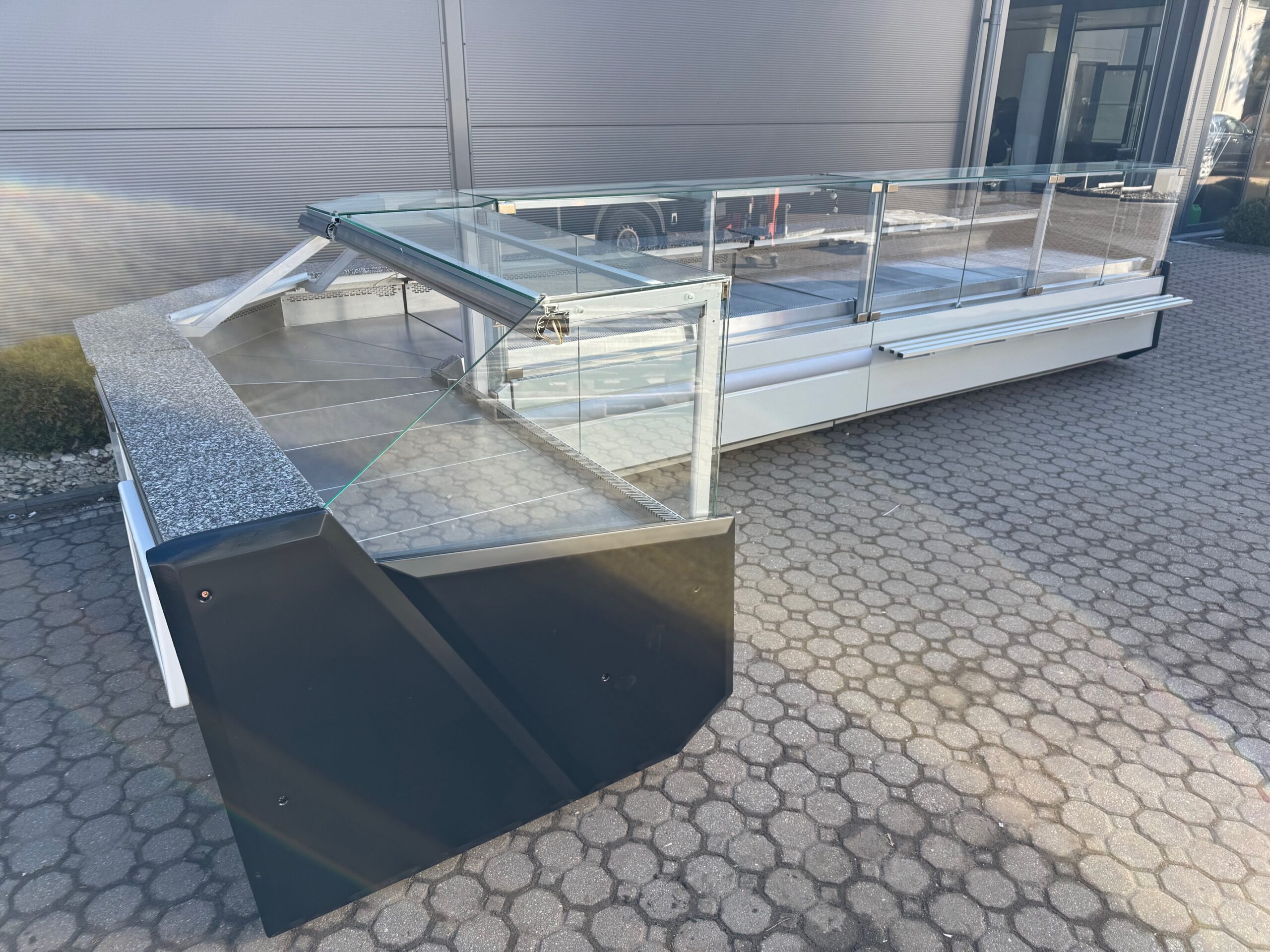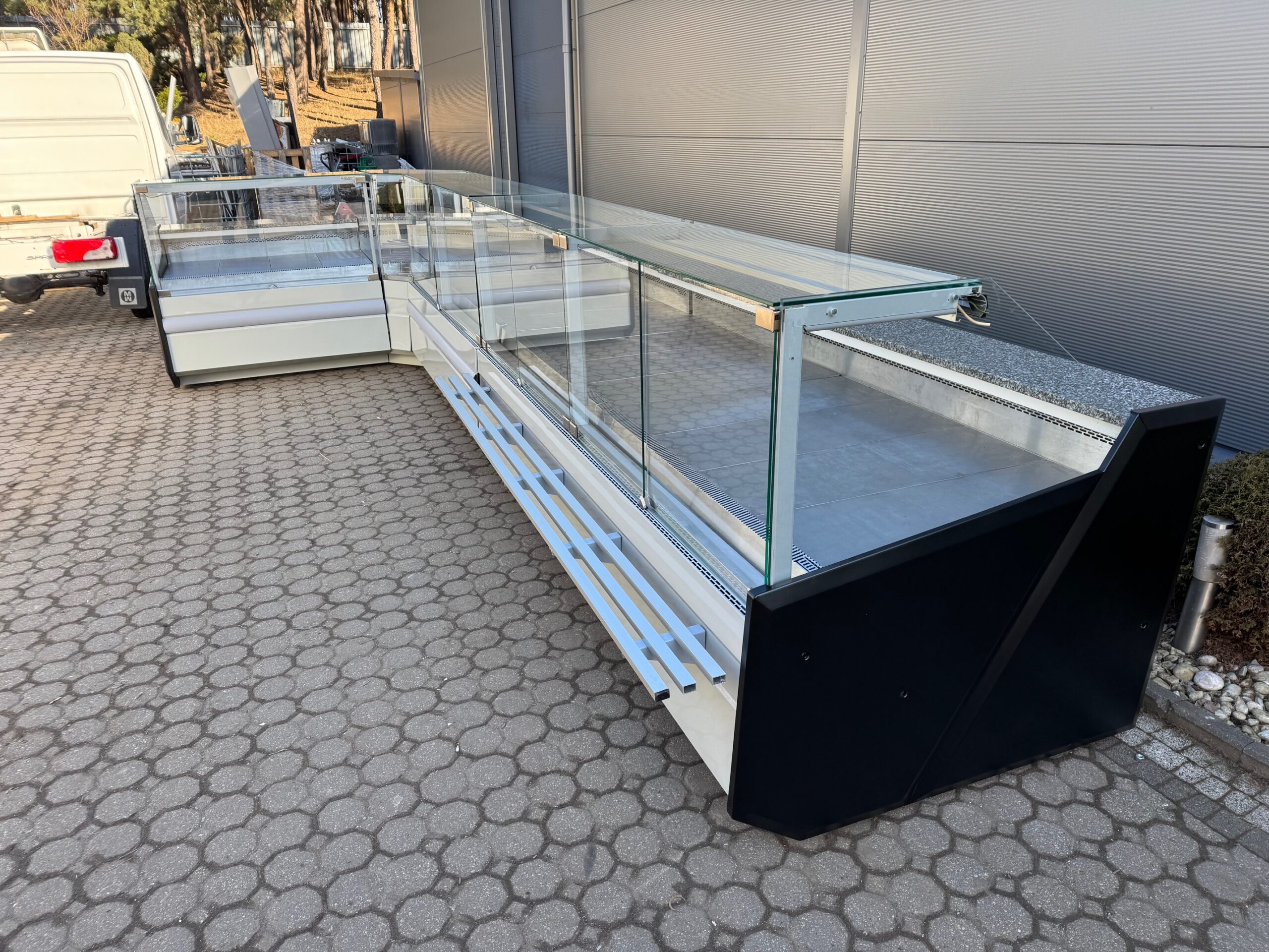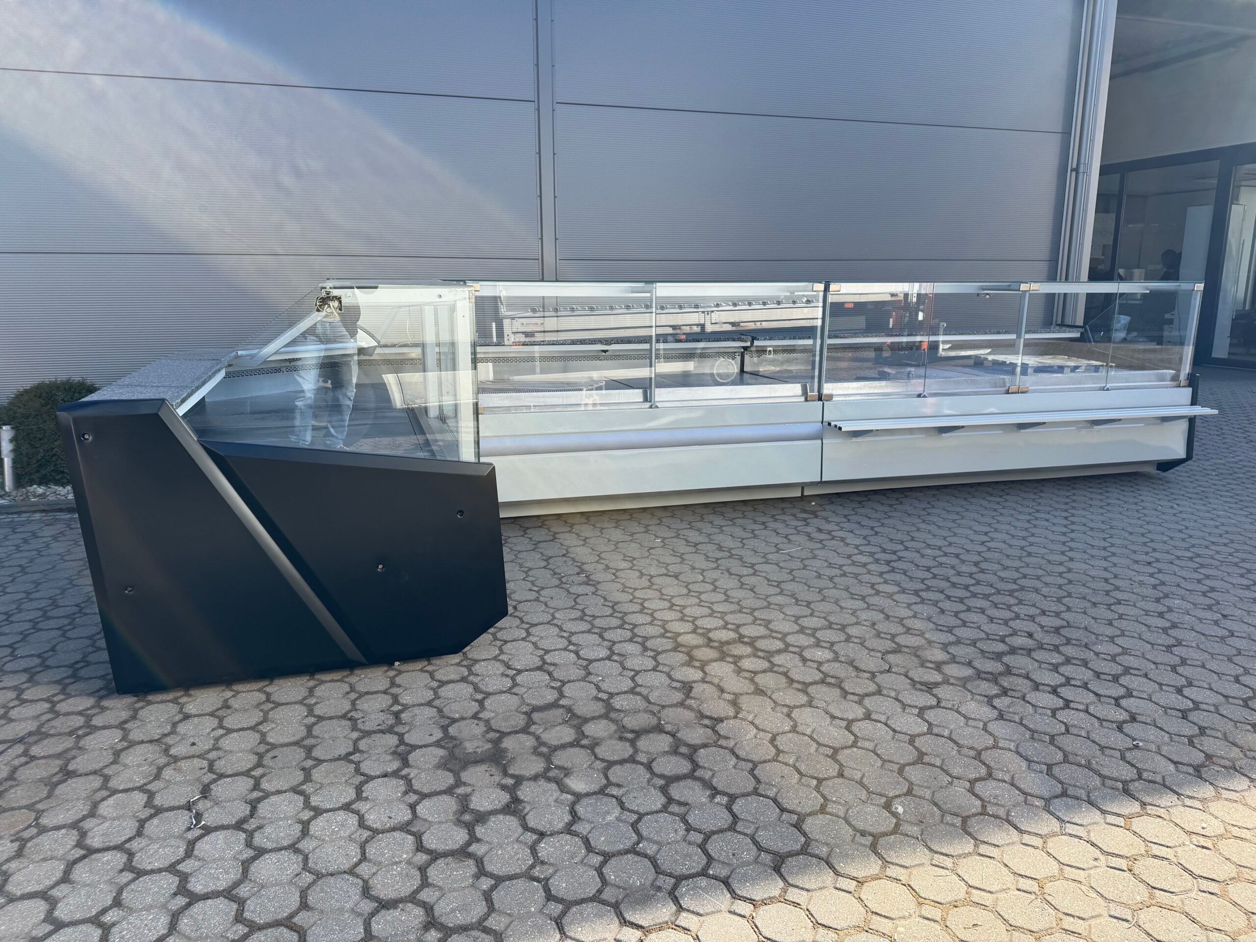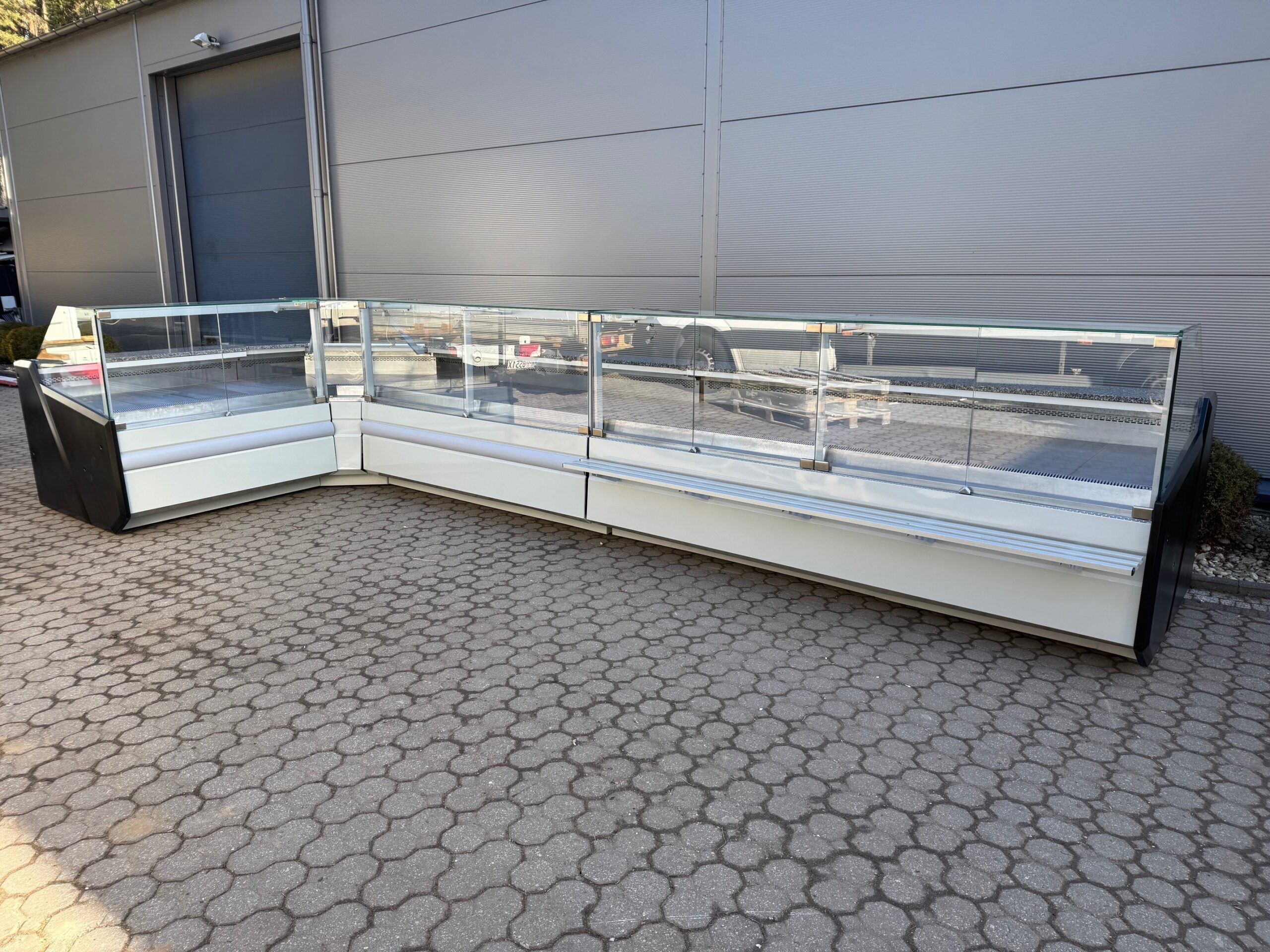 Lada chłodnicza firmy IGLOO SAMOS DEEP zestaw z narożnikiem 7 m. Jest używana po gruntownym przeglądzie. Atrakcyjny wygląd. Stan idealny. – zakres temperatury: +1ºC/+10ºC (Przy temp. otoczenia +25ºC i wilgotności wzgl. 60%) – pod agregat chłodniczy zewnętrzny ( bez agregatu) – chłodzenie dynamiczne – wymuszony obieg powietrza – boki izolowane z tworzywa sztucznego + boki szklane – kolor szary – korpus z oblachowaniem podstawy od strony obsługi z blachy powlekanej na kolor biały – oblachowanie podstawy frontowej i panel frontowy z blachy powlekanej na kolor szary. – izolacja z ekologicznej pianki poliuretanowej – przestrzeń ekspozycyjna z blachy nierdzewnej – komora przechowalnicza z blachy nierdzewnej – tylne drzwi komory przechowalniczej – rozwierne . – blat roboczy granitowy szary (grubość 20mm) – stelaż wewnętrzny i profile z aluminium – szyba frontowa prosta z systemem rozwiernym – przysłonki nocne z pleksy – lampa ze świetlówką LED – odbojnica frontowa – odszranianie automatyczne – odpływ kondensatu do pojemnika na skropliny – elektroniczny regulator temperatury z cyfrowym wyświetlaczem – alarm dźwiękowy informujący o zanieczyszczeniu skraplacza lub zablokowaniu pracy wentylatora
